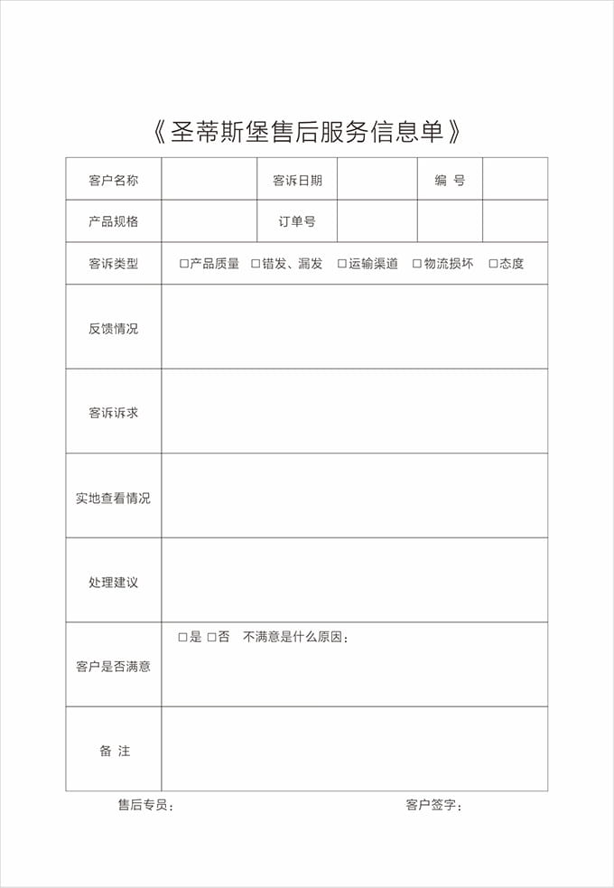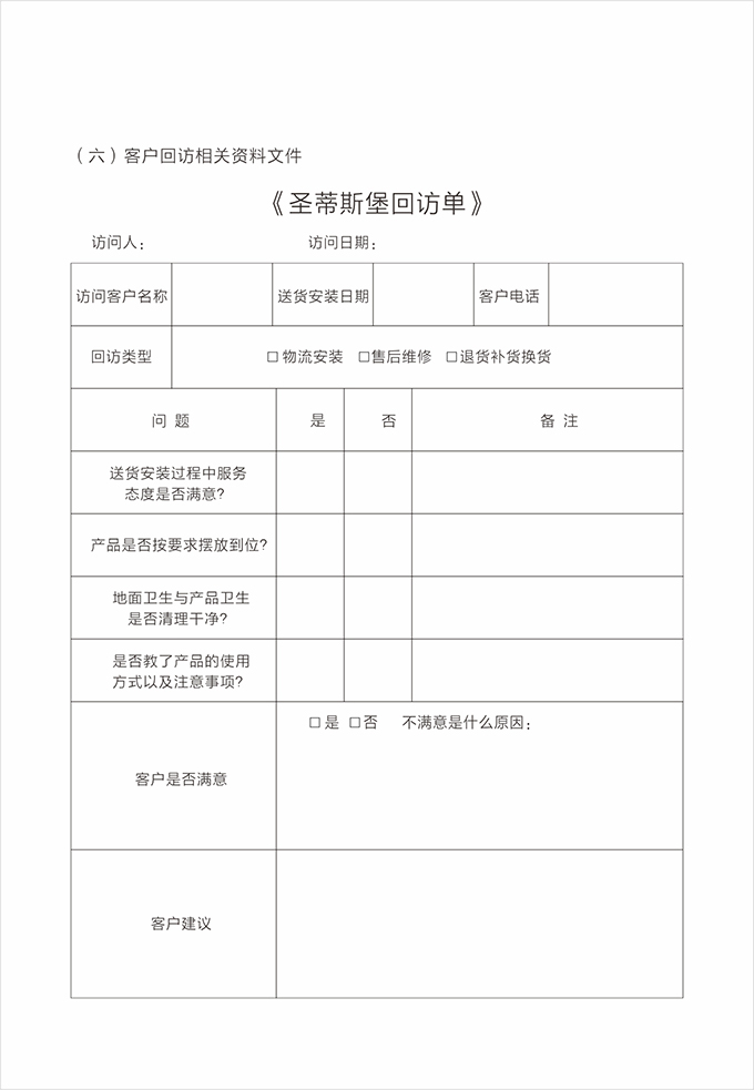 按要求认真填写服务记录单据并请顾客填写相应内容及签字,离开顾客处时除了与顾客本人告别外,还需要向有关负责人打招呼,询问是否还有其他问题,当得到顾客的满意允许后,方可离开。