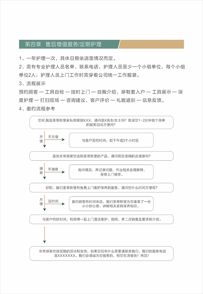 产品处理完毕后必须一站式通检,指导客户使用,并将服务过程中产生的垃圾随手带走,家具维修完毕后,应用毛巾将家具擦拭一遍,确保产品清洁。